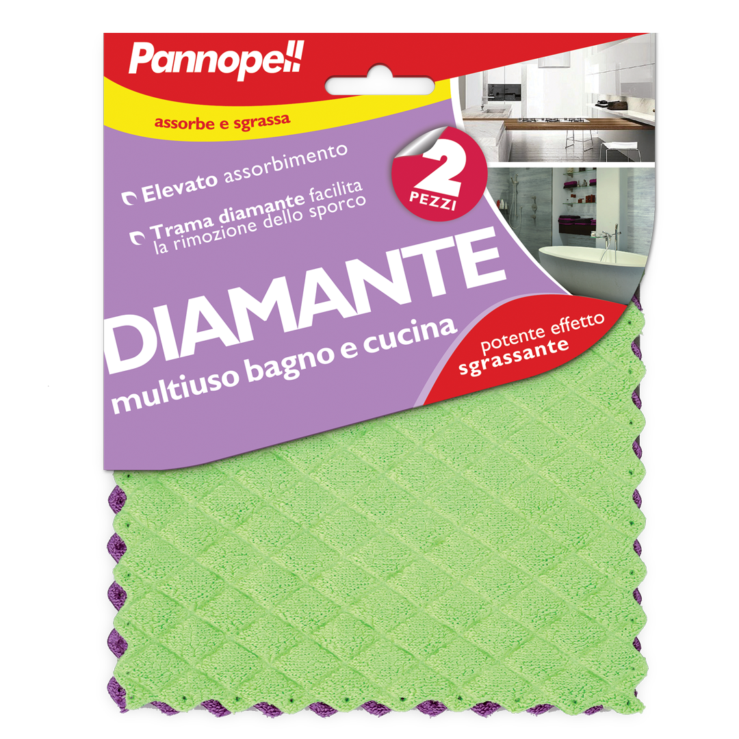 PANNO DIAMANTE è un pannospugna in microfibra microforata con trama cattura sporco.