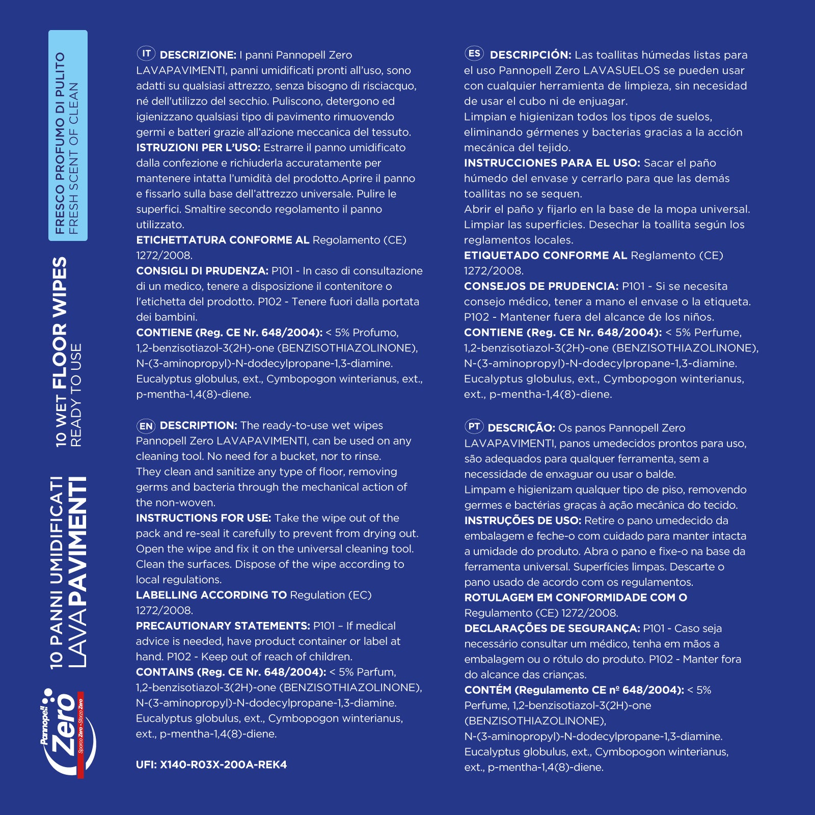 I panni Pannopell Zero LAVAPAVIMENTI, panni pronti all’uso, già imbevuti della giusta quantità di detergente e acqua, puliscono, detergono ed igienizzano qualsiasi tipo di pavimento rimuovendo germi e batteri grazie all’azione meccanica del tessuto.