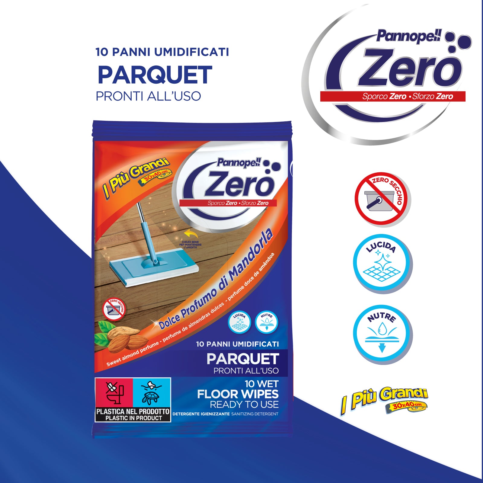I panni Pannopell Zero LAVAPAVIMENTI, panni pronti all’uso, già imbevuti della giusta quantità di detergente e acqua, puliscono, detergono ed igienizzano qualsiasi tipo di pavimento rimuovendo germi e batteri grazie all’azione meccanica del tessuto.